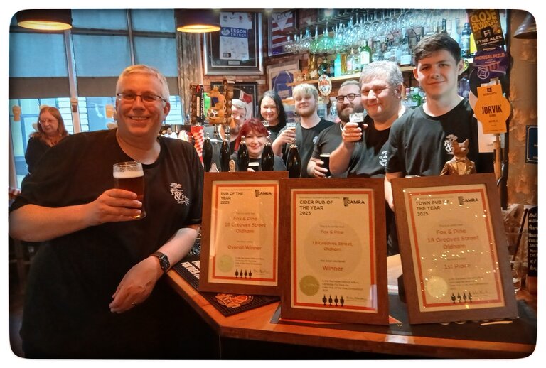 The Oldham Pub of the Year for 2025 is the Fox and Pine. They were also crowned overall Pub of the Year for the whole Branch, for the fourth year running!. Even better news followed for this fine establishment, when they were also judged to be Winner of Pub of The Year for the Greater Manchester Area. As such they went through to the next round but, alas, that was where the POTY competition ended for them,…Better luck next year. And let’s not overlook the fact that the pub also won overall Cider Pub of the Year for the Branch. Presentations of three award certificates were made by Mike Robinson, Deputy Chair.