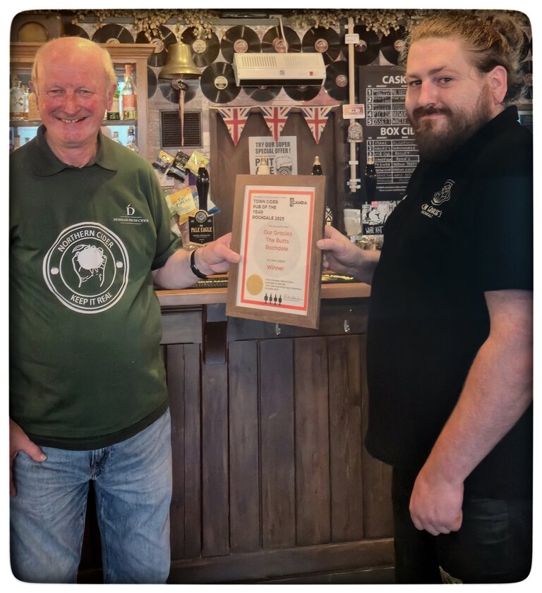 Our Gracie’s in Rochdale town centre was runner-up in the Branch Cider Pub of the Year competition, but proudly took the crown as Rochdale Town Cider Pub of the Year 2025. The presentation of the award took place on Saturday 19th April at 3pm. Pictured presenting the award to Manager, Kieron, is Mike Robinson our Branch Cider and Perry Rep, and Deputy Chair.